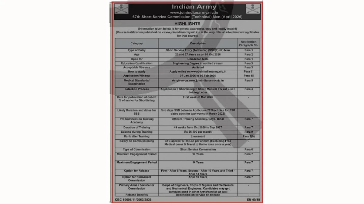 The Indian Army, a prestigious institution that plays a crucial role in safeguarding the nation’s integrity, has announced the recruitment for the SSC Technical 67th Men posts for the year 2026. This recruitment is a golden opportunity for candidates who aspire to serve in one of the most respected organizations in India. The SSC Technical recruitment process allows young men to join the Indian Army as officers, showcasing their technical skills and contributing to national security.