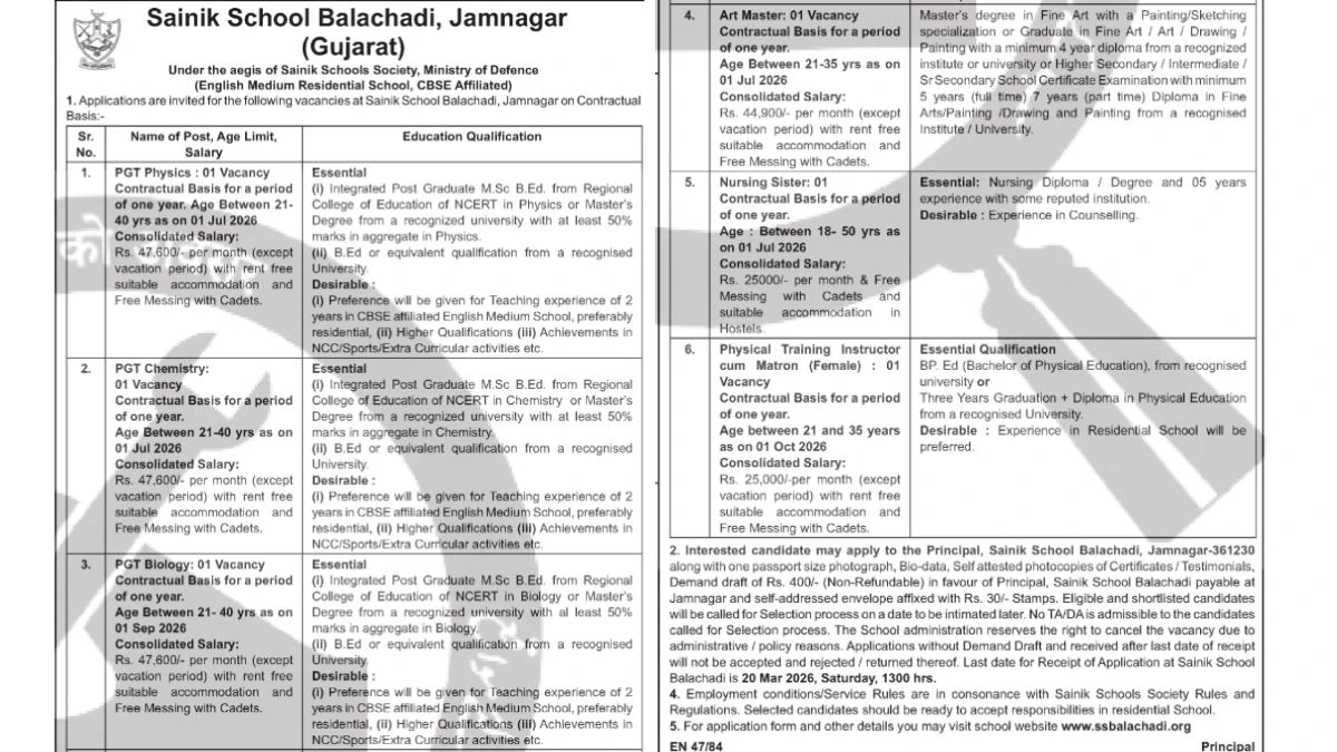 Sainik School Balachadi, located in Jamnagar, is a prominent institution under the Sainik Schools Society, which operates under the Ministry of Defence, Government of India. The school is known for its commitment to providing quality education and character development to young boys, preparing them for a career in the armed forces. The announcement for the recruitment of various posts, including PGTs, Art Master, Nursing Sister, and PTI cum Matron, marks a significant opportunity for candidates seeking positions in this prestigious institution.